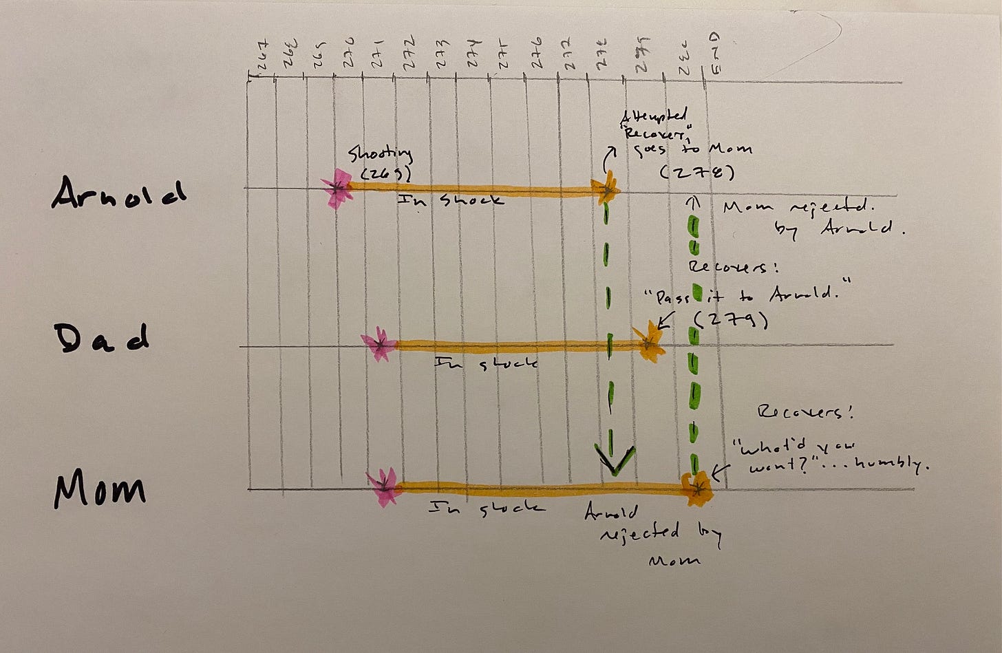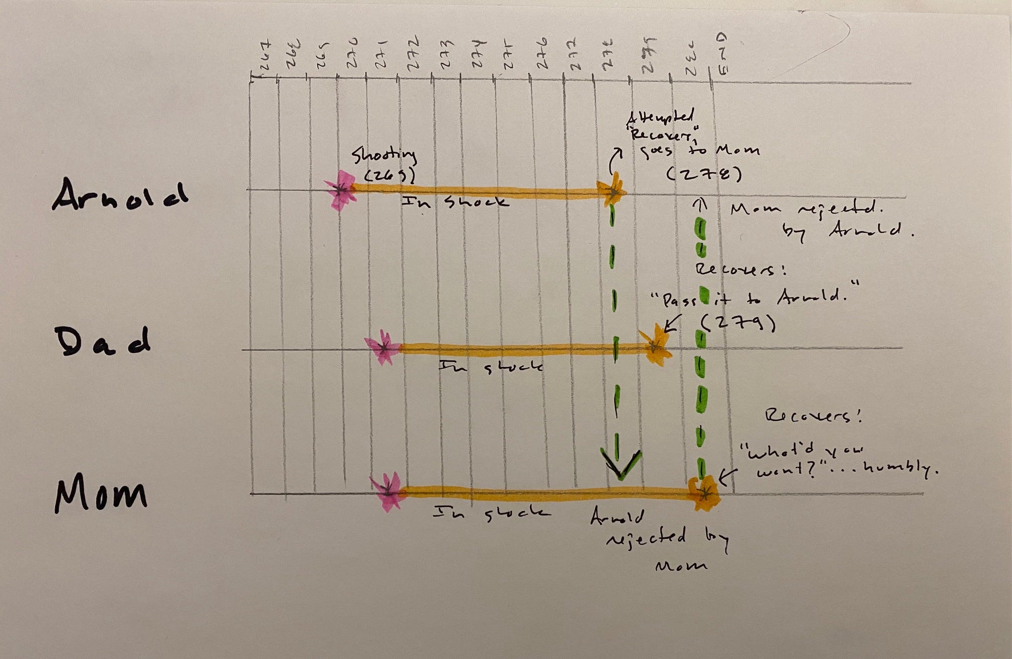 None of the above is told overtly. It comes to us by way of the timing of the story’s events – this offset in the three different patterns (Arnold’s, dad’s, mom’s) of “shock, coldness, recovery.”