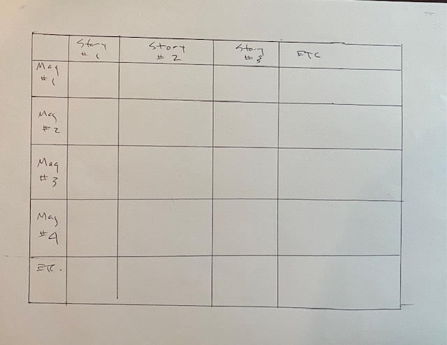 Back when I was working at the engineering company, I made a little matrix, with magazines along the vertical axis and the names of stories I thought were good enough to send out on the horizontal axis1.