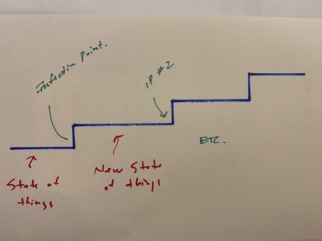 Related to this, I sometimes might think in terms of inflection points. If we think of a scene as a line graph, with the passing pages along the horizontal axis and Dramatic Energy along the vertical, where does the line jump up? At what points does the fundamental reality of the scene shift?