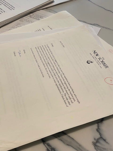 Last Sunday, behind the paywall, for paid subscribers, I offered some early drafts of a story of mine called “CommComm,” as well as some samples of the edits I did with Deborah Treisman at The New Yorker.