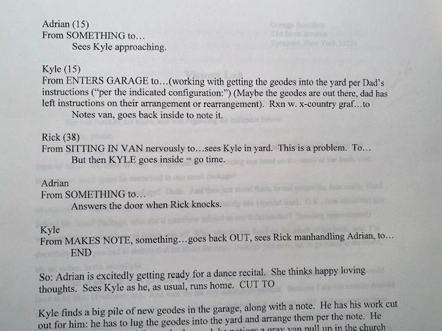 Going through my old drafts, I see that I do a lot of this type of “note-to-self” thing, in which I am trying to tell myself the story, mostly to see if it’s simple enough. A narrative should be able to be relayed fairly simply, in terms of its action (my theory goes), and we should be able to recount the causation to ourselves without too much propping up or theorizing (“this is necessary because of my plan to contrast light w dark” and so on). Just….what happens? And how are the things that happen related? How does A cause B?